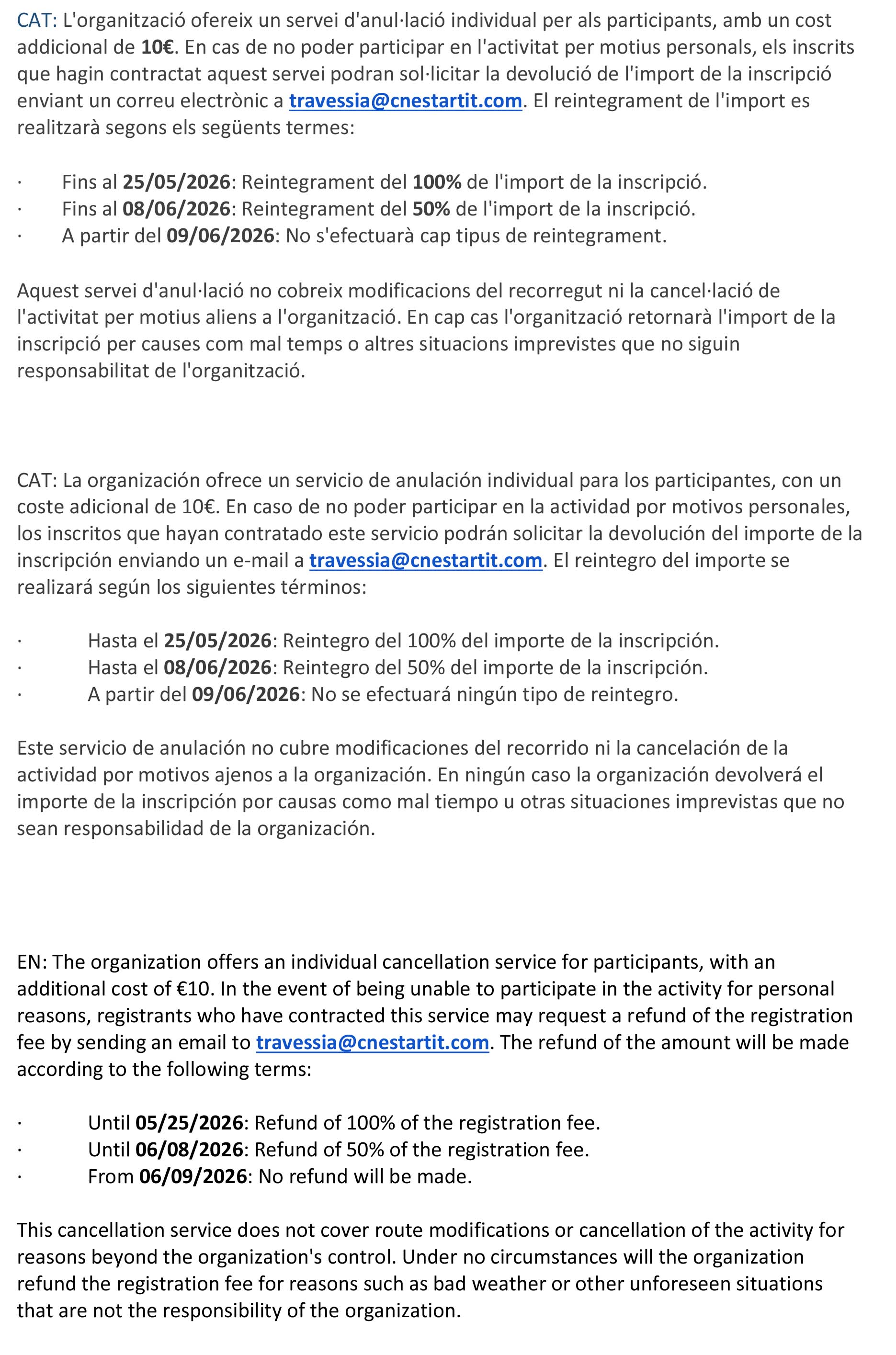 La contractació de la inscripció a aquest esdeveniment lúdic/esportiu a Championchip Cat S.L. en nom de l'Organitzador, suposa l'acceptació del reglament de la cursa i de les següents condicions: